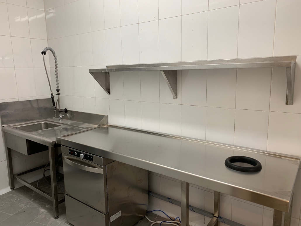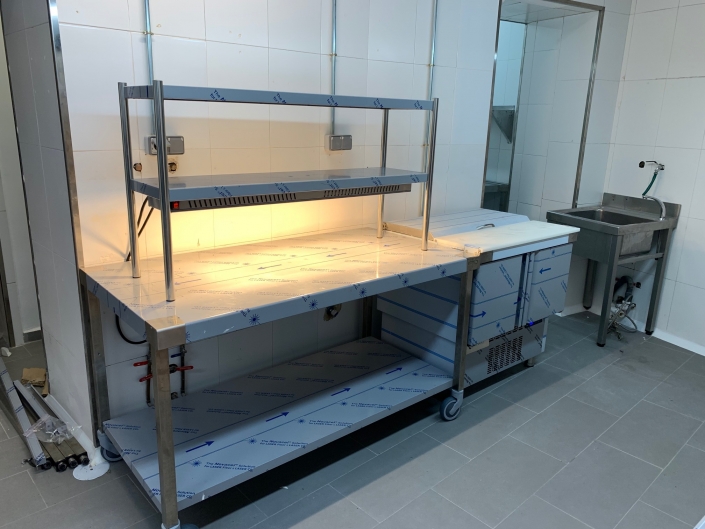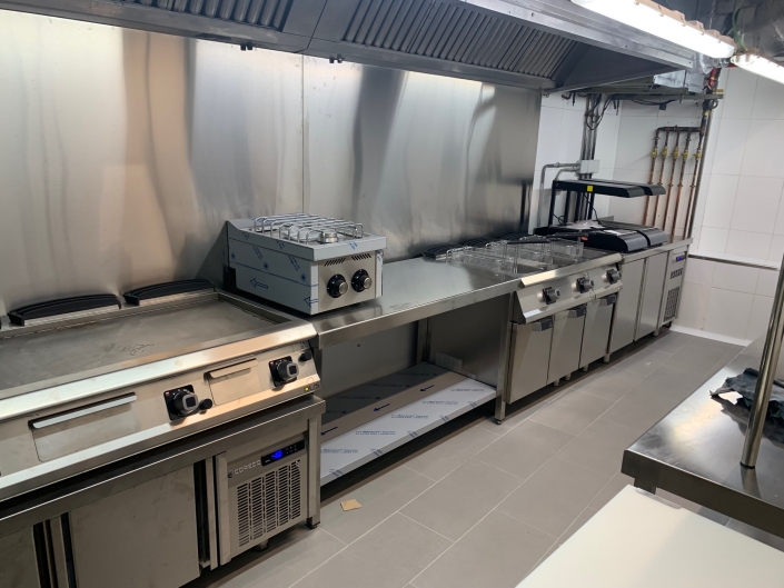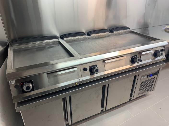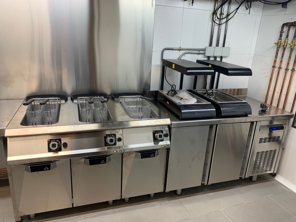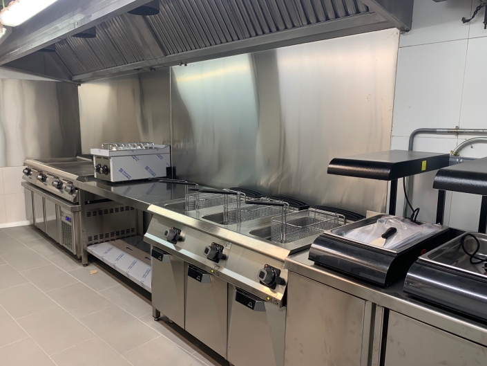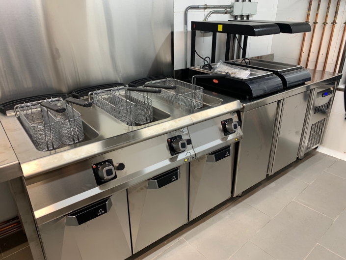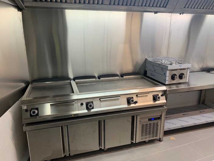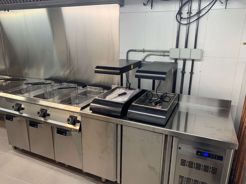 Esta vez contamos con un espacio bastante amplio donde ya contaban con campana lo que nos hizo un poco mas sencillo el tema de la distribucion. Luego de un gran estudio sobre esa cocina para hacerlo 100% funcional, hemos optado por colocar 2 planchas, 3 freidoras, mesa neutra de preparacion entre ambos elementos y justo detrás, mesa de trabajo con 2 estantes con luz calefactada en la zona del pase, mesa de ingredientes y una zona de lavado con lavavajillas y una mesa con aro de desbrace. También colocamos armarios de frio y congelación de gran capacidad.