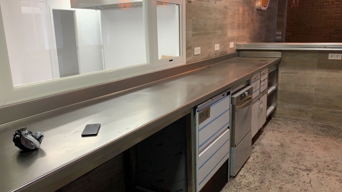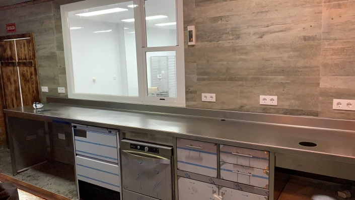 En la zona de la barra hemos hecho un mueble tras barra a medida con fabricador de hielo, lavavajillas, expositor de bebidas, todos empotrados para obtener un mejor acabado. El bajo barra cuenta con un seno, mesa fria de preparación y 2 vitrinas para la exhibición del producto a ofrecer.