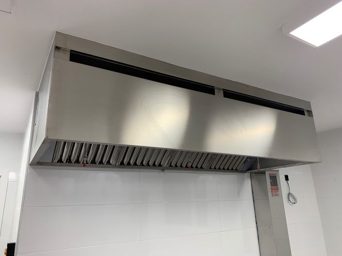 Contamos con un espacio bastante amplio donde hemos decidido colocar la zona de cocción con campana compensada y sistema de extinción de incendios. Como equipos colocamos una cocina de 4 fuegos, freidoras de sobremesa de 2 cubas y fry-top.