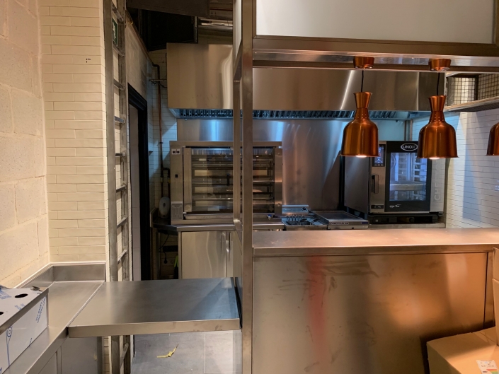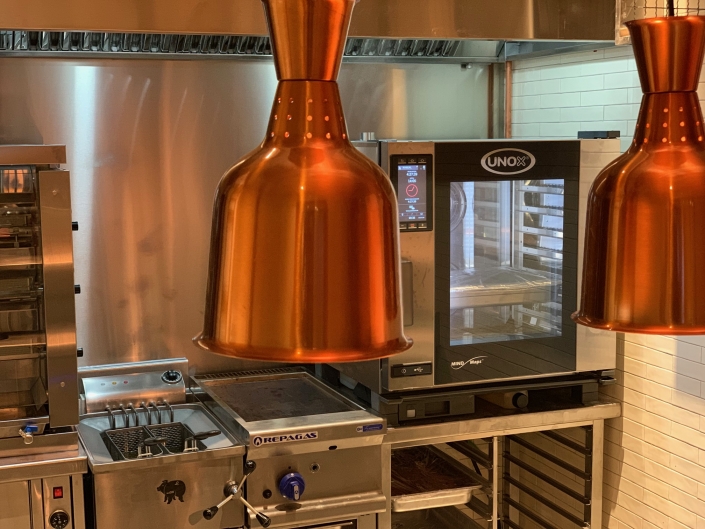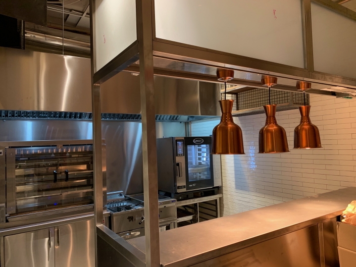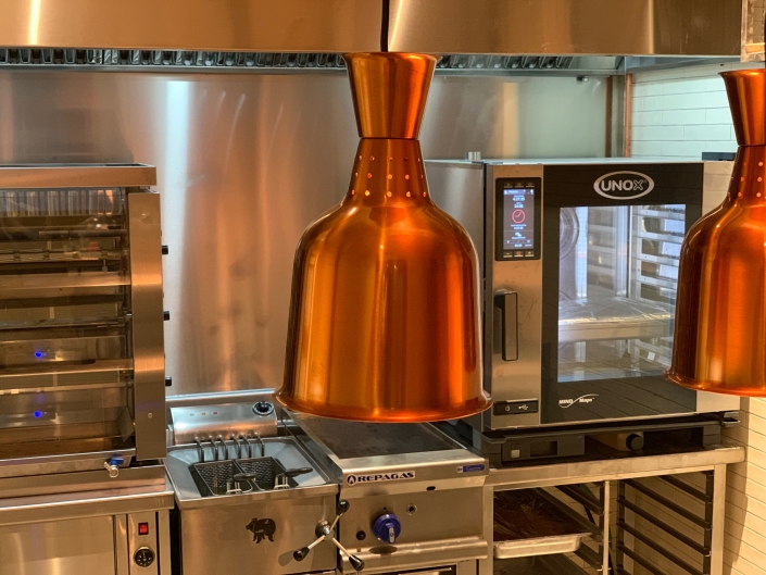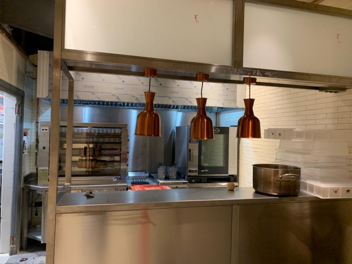 El Equipamiento Hostelero consta de una cocina completa con Extracción, Sistema de Extinción de Incendios, freidora de alto rendimiento, asador, horno de conveccion y zona de preparacion con lamparas de calor.
