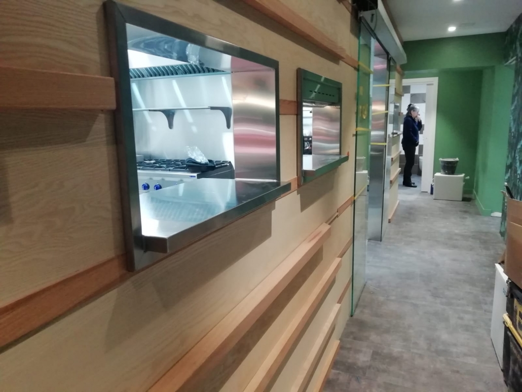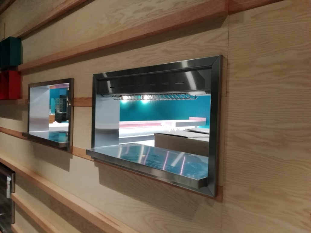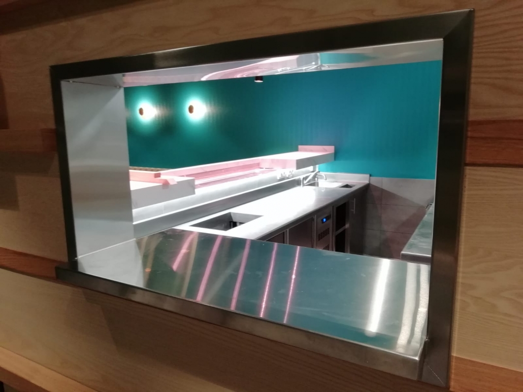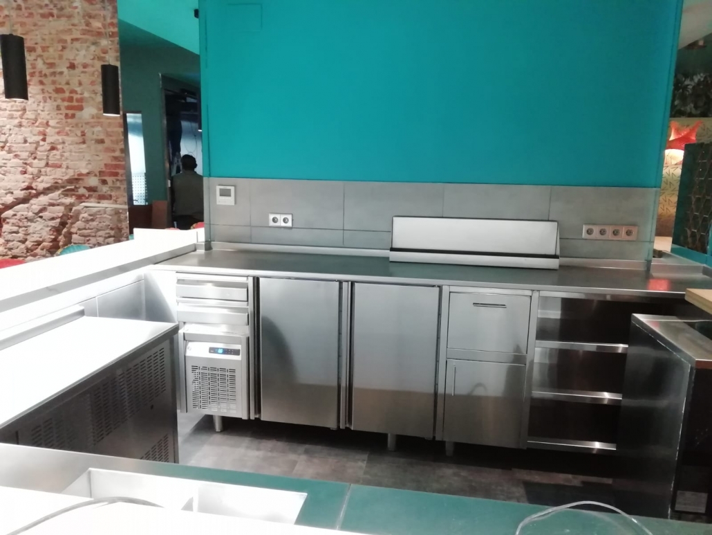 En la zona de lavado contamos con mesa de entrada, lavavajillas de capota y mesa de salida. En la zona de preparación colocamos muebles a medida con seno y hueco para cubeta de ingredientes encastradas como también estante caliente y neutro con marco perimetral en acero inoxidable. Y por ultimo en la zona de barra hemos hecho muebles a medida con mesas frias empotradas. Sin duda alguna este ha sido un proyecto a medida con muchos detalles que hacen una cocina abierta bastante llamativa debido a sus forrados de pared en inox, los detalles en el pase y una decoracion increible, hacen de este restaurante un proyecto fantastico!.
