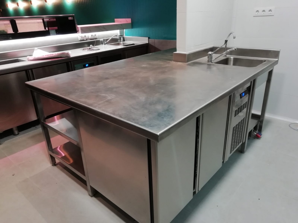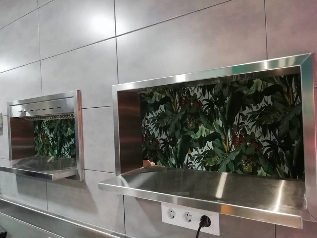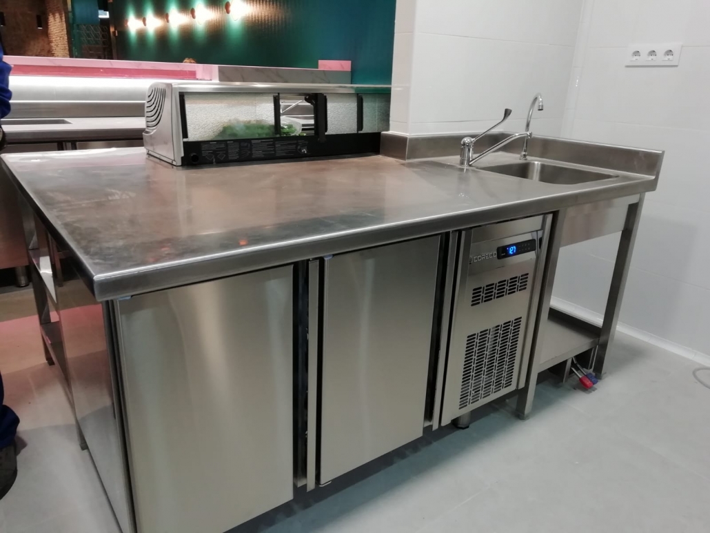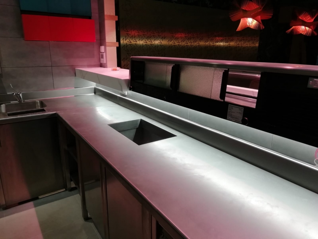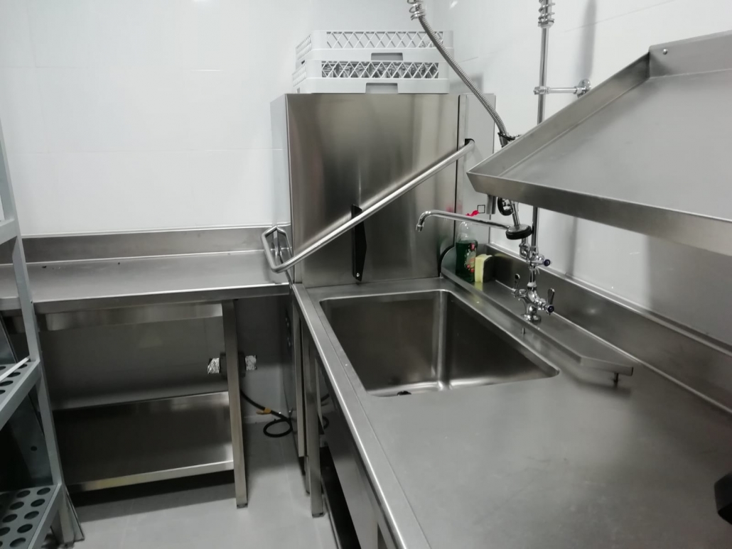 En la zona de lavado contamos con mesa de entrada, lavavajillas de capota y mesa de salida. En la zona de preparación colocamos muebles a medida con seno y hueco para cubeta de ingredientes encastradas como también estante caliente y neutro con marco perimetral en acero inoxidable. Y por ultimo en la zona de barra hemos hecho muebles a medida con mesas frias empotradas. Sin duda alguna este ha sido un proyecto a medida con muchos detalles que hacen una cocina abierta bastante llamativa debido a sus forrados de pared en inox, los detalles en el pase y una decoracion increible, hacen de este restaurante un proyecto fantastico!.