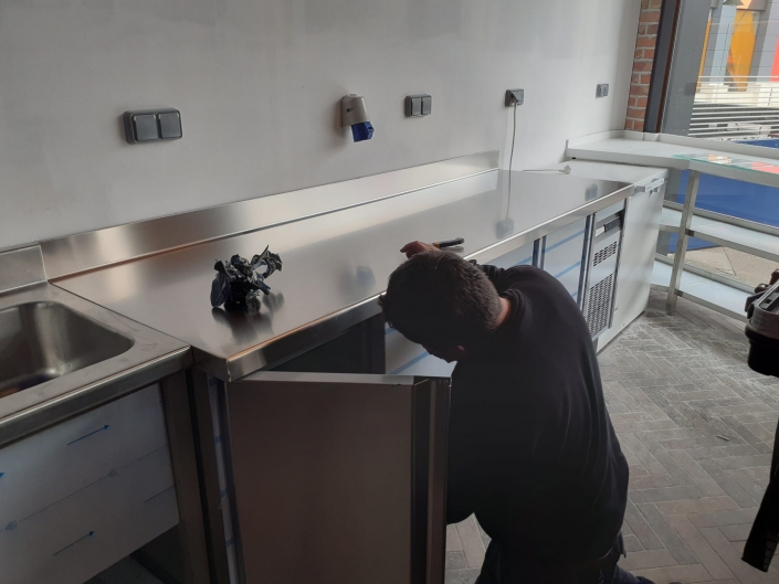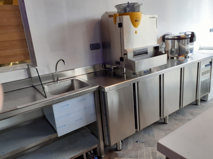 En la zona del trasbarra hemos fabricado un mueble en inox a medida con seno, una mesa refrigerada de 3 puertas y encima una freidora QUIALITYFRY sin humos.
